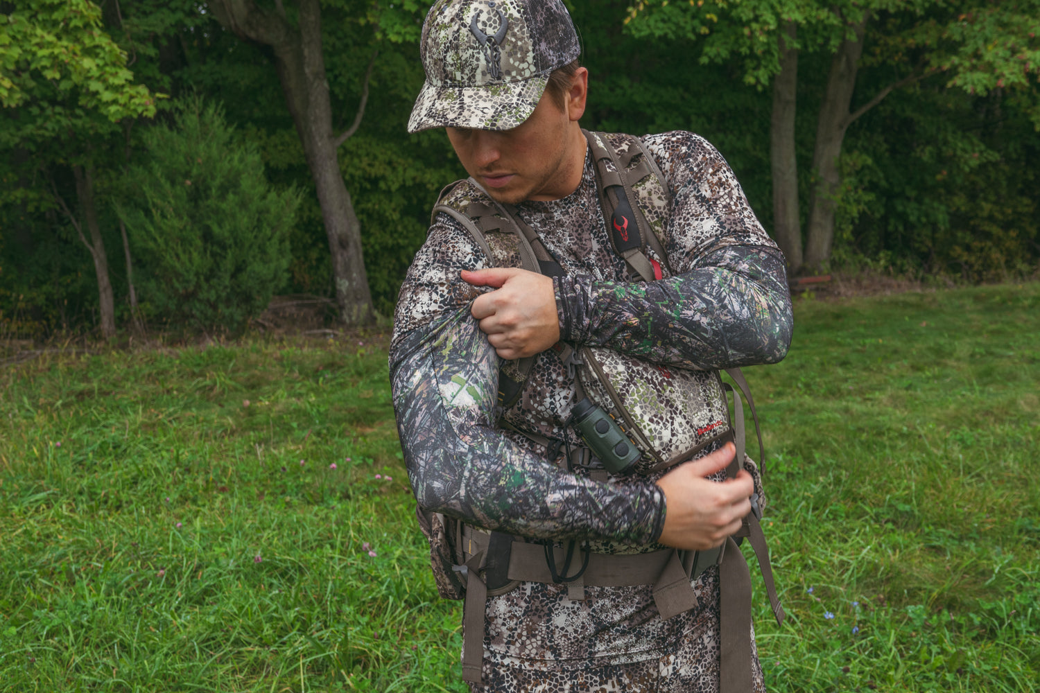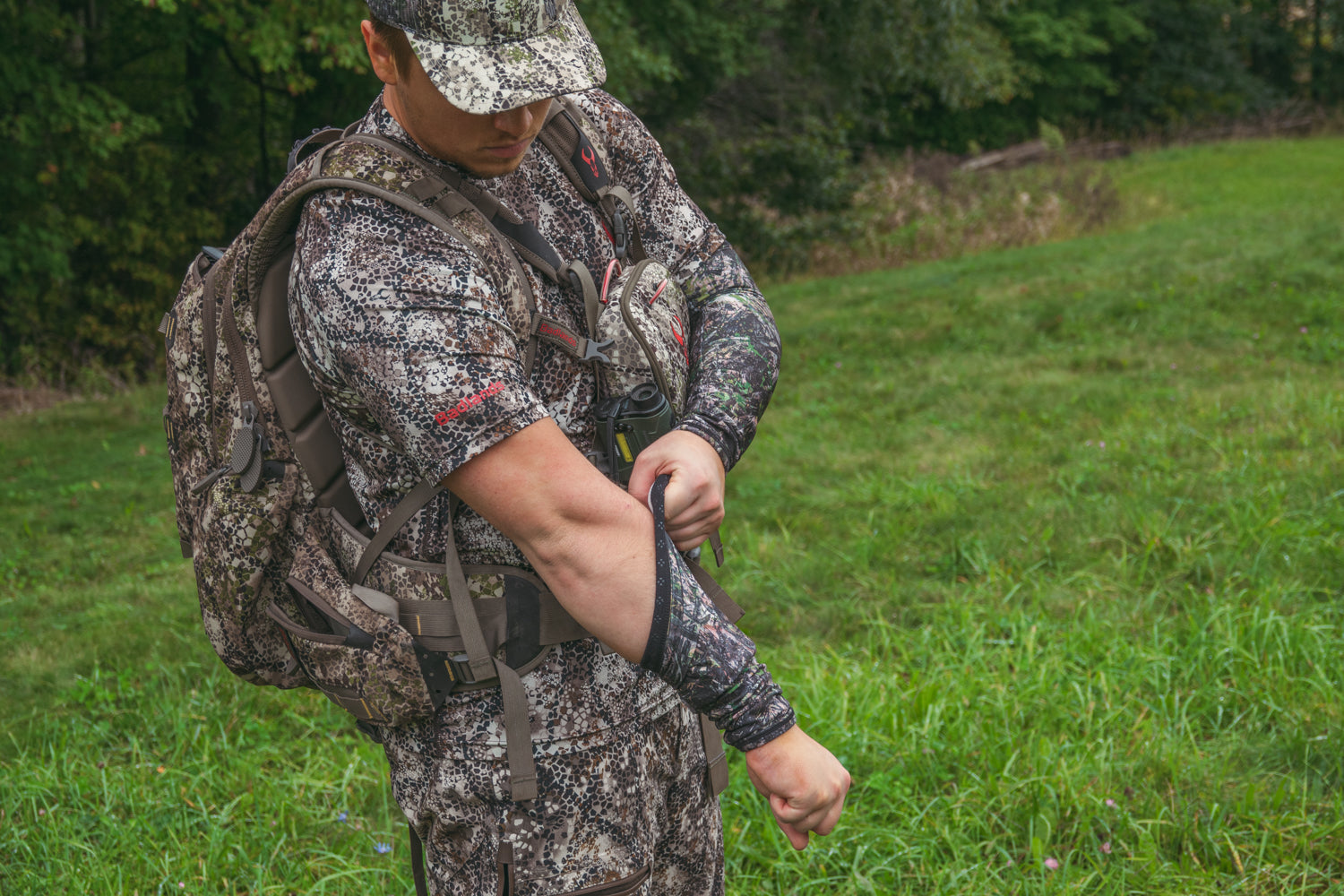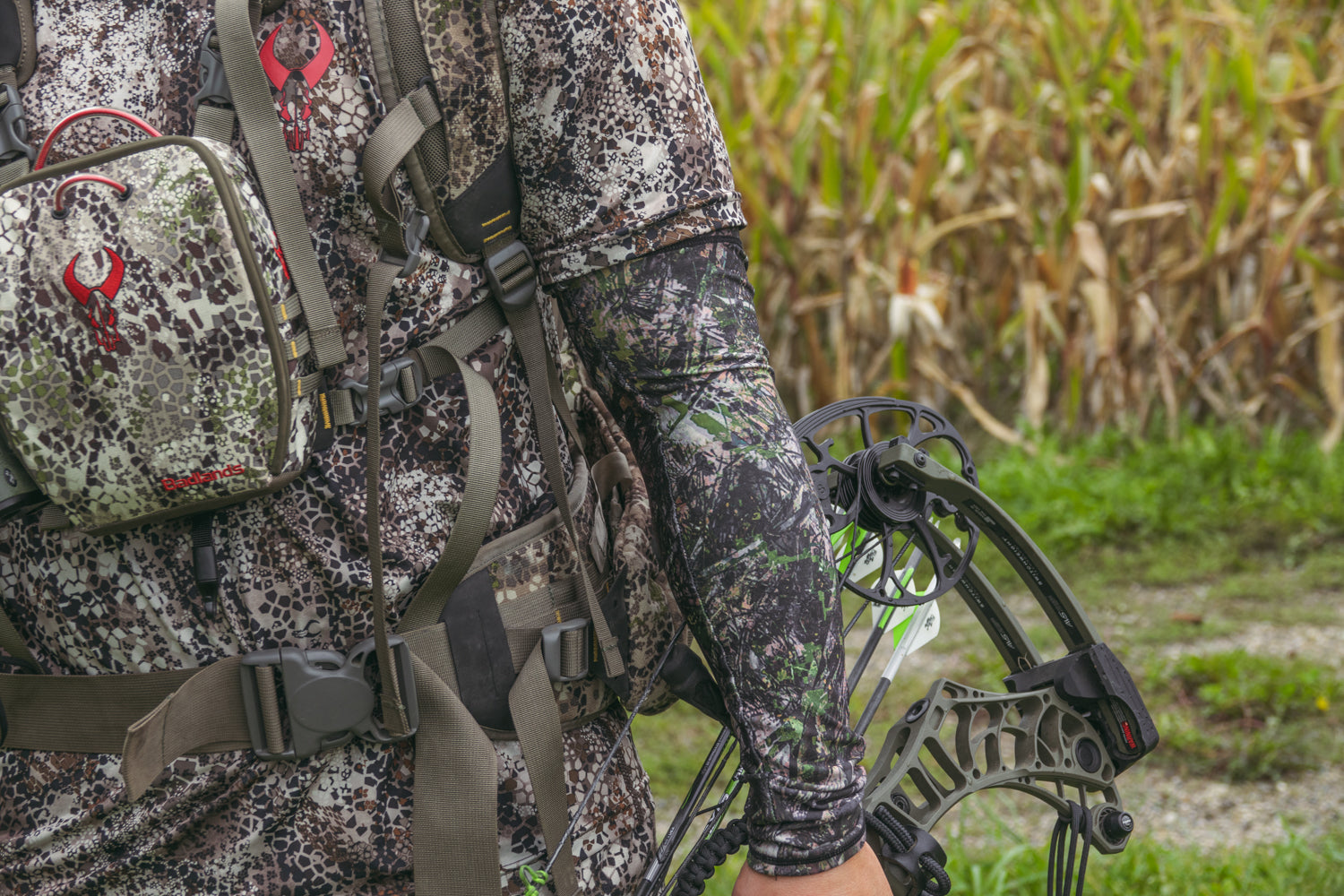 We've all been on the hot and cold roller coaster. When you walk to your stand or hike through the mountains, its easy to overheat if you have too much on. But as soon as you stop moving, the cold sets in. Adding and then removing layers can be a hassle. That problem is solved with our thermal arm sleeves. Arm sleeves are easy to put on and take off or just roll them up on your wrist when you are hot and slide them back up when you are cold. Our Fourth Arrow Arm sleeves are soft, warm, and breathable and feature our own camo pattern to keep you hidden in the woods.