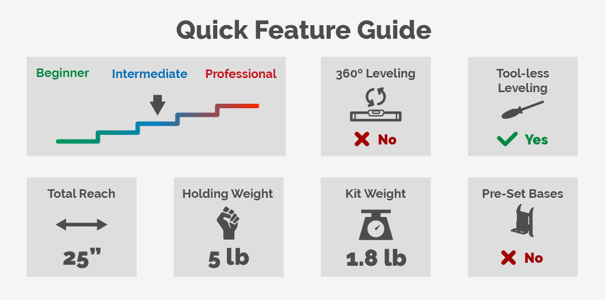 The Minimalist base is extremely lightweight at only 9 oz. Its super easy to level with the leveling screw. The 3 section triple arm reaches out to 24 inches to ensure you can capture every moment but yet its small enough to easily slide between your bridge.